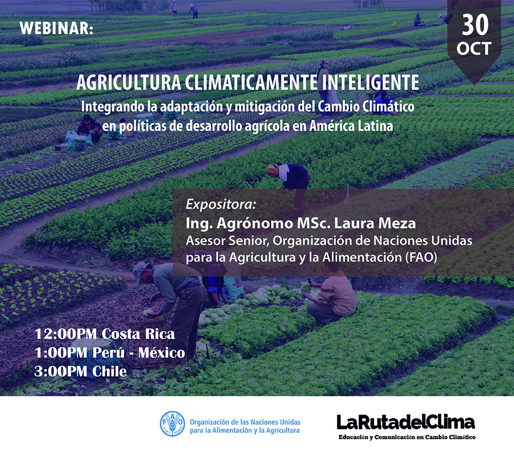 Este webinar contará con la participación de la Ing. Agrónomo MSc. Laura Meza, Asesor Senior de la FAO, quien ofrecerá una introducción al concepto de Agricultura Climáticamente Inteligente (ACI), con ejemplos de casos aplicados en Latinoamérica y otros. Este concepto fue desarrollado por la FAO el año 2010 para relevar el rol de la agricultura frente a los desafíos de seguridad alimentaria, desarrollo y enfrentamiento del cambio climático. La ACI persigue mejorar la capacidad de los sistemas agrícolas para prestar apoyo a la seguridad alimentaria, e incorporar la necesidad de adaptación y las posibilidades de mitigación en las estrategias de desarrollo agrícola sostenible.