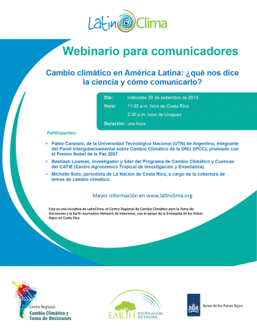 El webinario es organizado por LatinClima, la Earth Journalism Network de Internews y el Centro Regional de Cambio Climático y Toma de Decisiones, con el apoyo de la Embaja de Holanda en Costa Rica.
