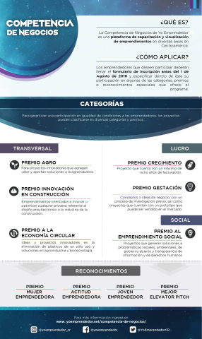 La Competencia de Negocios de Yo Emprendedor es un programa abierto para todos los emprendedores que cuentan con ideas de negocio, prototipos o bien, empresas en marcha, que desean competir con sus proyectos a través de un concurso con etapas de capacitación, presentación y eliminatoria, con el fin de seleccionar a los emprendimientos con más alto potencial de crecimiento y nivel de innovación. En este proceso validan sus ideas, adquieren experiencia, tienen acceso a premios valorados en más de $100 mil dólares y redes de contacto, además que se dan a conocer ante un público selecto convocado para apoyar a estos emprendedores.