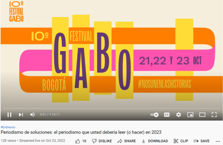 Video de charla: Periodismo de soluciones: el periodismo que usted debería leer (o hacer) en 2023, en el marco del 10 Festival Gabo. Jonathan Gutiérrez, Javier Drovetto y Carolina Gil Posse con la moderación de Fabrice Le Lous.