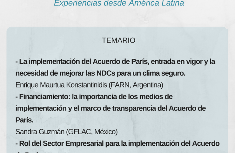 Video del webinarioEste webinario tuvo lugar el pasado 30 de setiembre, organizado por LatinClima y el Centro Regional de Cambio Climático y Toma de Decisiones. Contó con la participación de Enrique Maurtua, director de Cambio Climático de FARN, quien habló sobre la implementación del Acuerdo de París, su entrada en vigor y la necesidad de mejorar las Contribuciones Nacionales (NDC) para un clima seguro; Sandra Guzmán, fundadora y coordinadora General del Grupo de Financiamiento Climático para Latinoamérica y el Caribe (GFLAC), quién se refirió al tema de financiamiento: la importancia de los medios de implementación y el marco de transparencia del Acuerdo de París; y Manfred Kopper, director de la Dimensión Ambiental de la Asociación Empresarial para el Desarrollo (AED), quien brindó una mirada desde el sector empresarial.